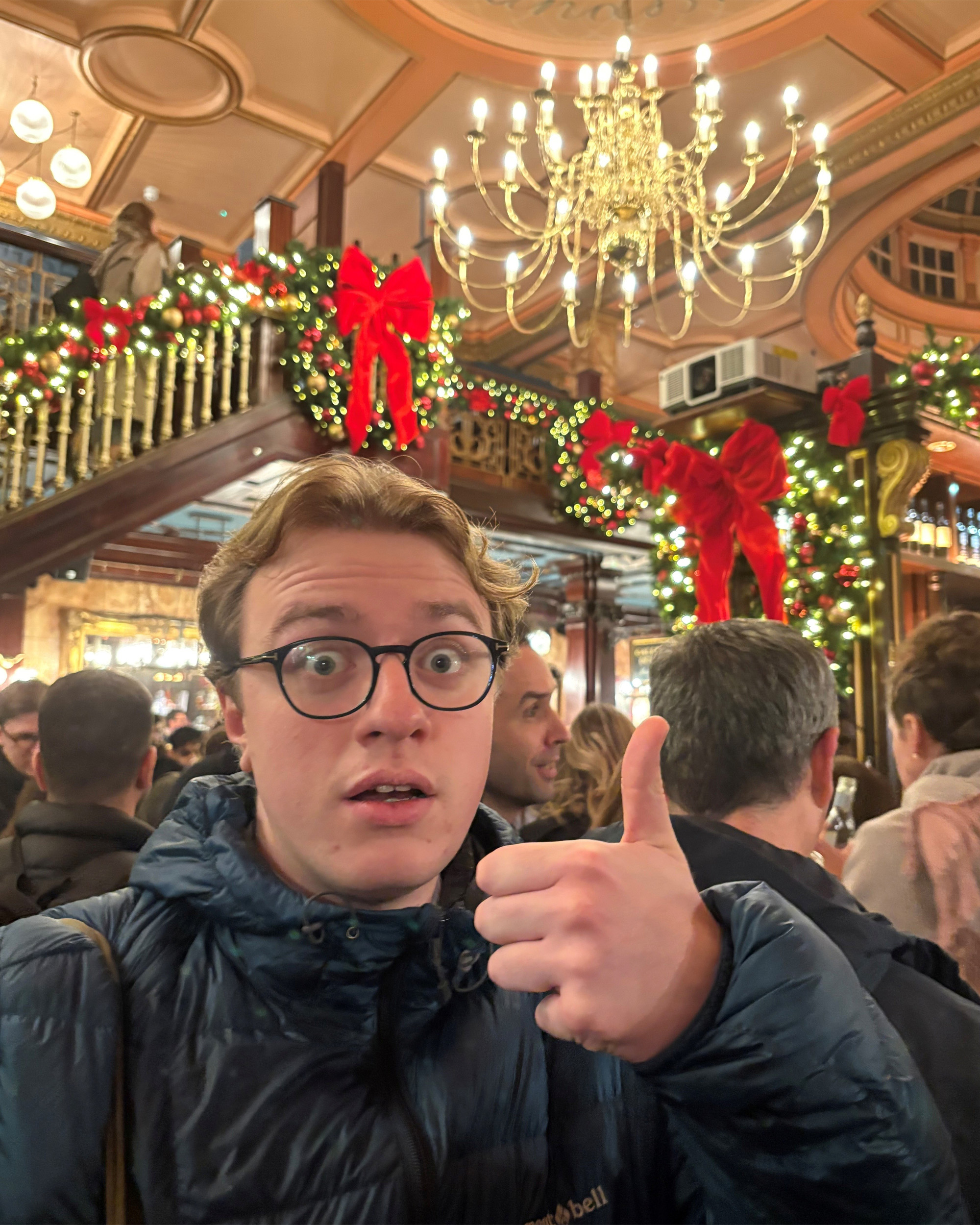 In the photo below we see our conquering hero presenting that most hallowed of praise, the thumbs up. Look at those bows! Look at those lights! I felt like I’d died and gone to Finlay’s festive heaven. I’m knocking some points off for not doing something to the chandelier, but a real sterling effort.